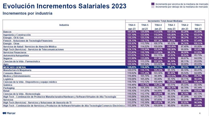 Según la última edición de la encuesta Tendencias de Incrementos Salariales en Argentina – TISA#6 realizada por la consultora de recursos humanos Mercer, las 12 industrias que prevén otorgar incrementos por encima del mercado general (120,05%) a su personal fuera de convenio son: