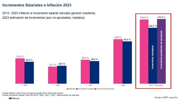 Los datos surgen de la encuesta de Tendencias de Incrementos Salariales en Argentina (TISA) de Mercer realizada del 17 al 24 de agosto de 2023 en la que participaron 456 empresas. La encuesta TISA contempla 8 ediciones anuales con el objetivo de relevar las proyecciones salariales de las empresas en el país.