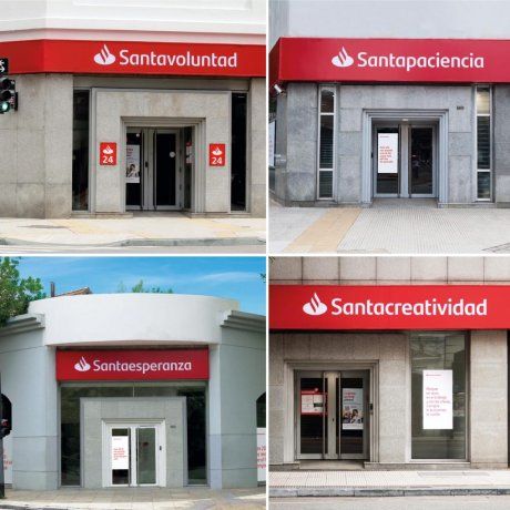 Se intervinieron las marquesinas de las sucursales. Así, se pueden observar estas virtudes junto a la marca “Santander” y debajo se explican las razones de la elección de esas palabras: