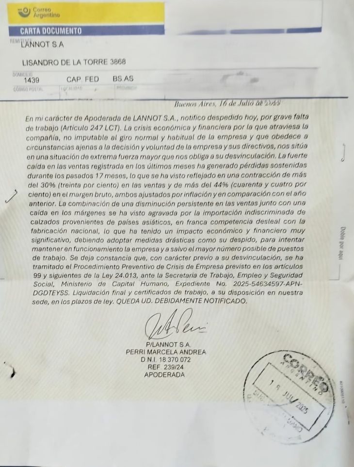 Los telegramas de despido, enviados bajo la razón social Lannot S.A., alegan “grave falta de trabajo” y citan el artículo 247 de la Ley de Contrato de Trabajo. La compañía había intentado tramitar un Procedimiento Preventivo de Crisis para pagar apenas el 50% de las indemnizaciones, pero la propuesta no fue aceptada por el sindicato. De todos modos, los despidos se concretaron y los trabajadores aún reclaman el pago de lo que les corresponde.