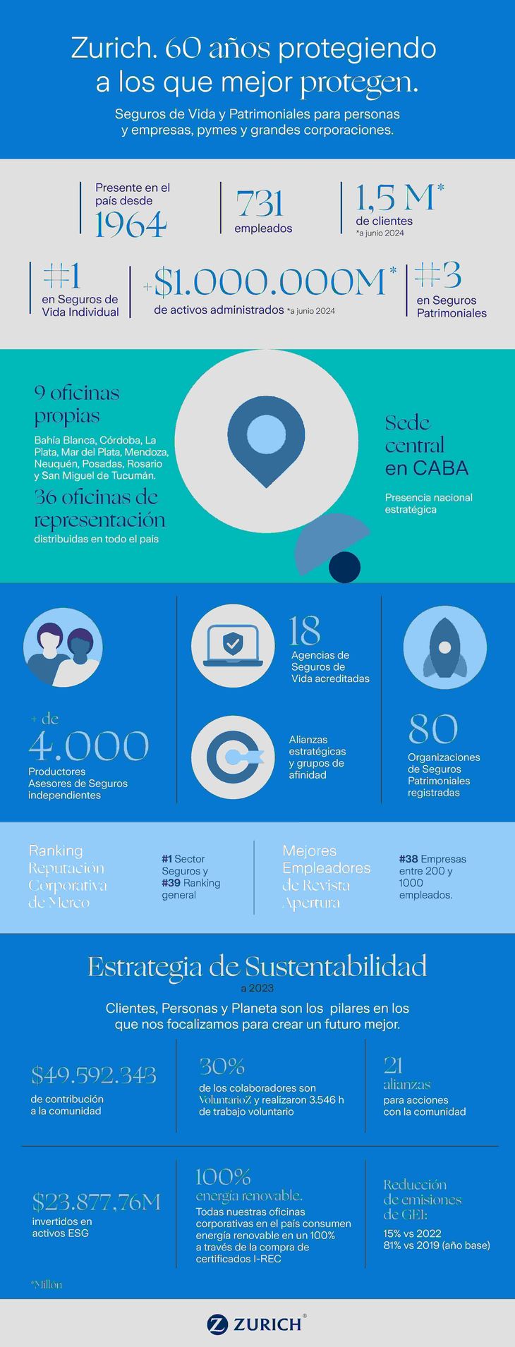 Zurich, compañía líder de la industria aseguradora, celebró el aniversario 60° desde su llegada a la Argentina para ayudar tanto a personas como empresas a comprender y protegerse de los riesgos. La compañía, con sede central en la ciudad de Buenos Aires, se encuentra en pleno proceso de expansión de su red de cobertura local, integrada por 9 oficinas propias y 36 oficinas delegadas de representación distribuidas estratégicamente en todo el país, alianzas, partners, grupos de afinidad y más de 4.000 profesionales independientes, altamente capacitados para brindar un asesoramiento profesional y personalizado.