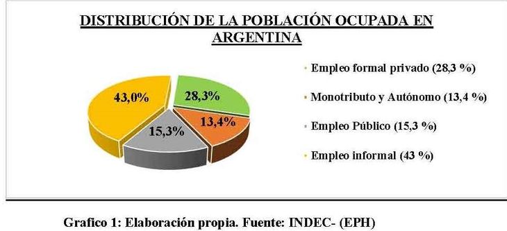 La distribución del empleo informal en porcentuales, se conforma aproximadamente de la siguiente forma: El 63% serían asalariados (aproximadamente. 5.580.000), el 34 % (aproximadamente, 3.015.200) autónomos y monotributistas y el 3% restante en empleadores y trabajadores familiares. (Fuente: Ministerio de Capital Humano- Secretaría de Trabajo Empleo y Seguridad Social).