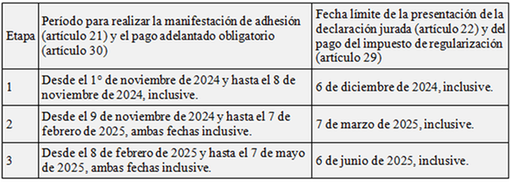 Como consecuencia de la prórroga del plazo para adherir a la primera etapa del blanqueo, y la modificación en bloque de las siguientes, la AFIP mediante Resolución General 5.596 (BO 4/11/24) adaptó lo regulado por la RG 5.528 a fin de considerar las disposiciones del Decreto 977/24 (1), con vigencia desde el 1/11/24.