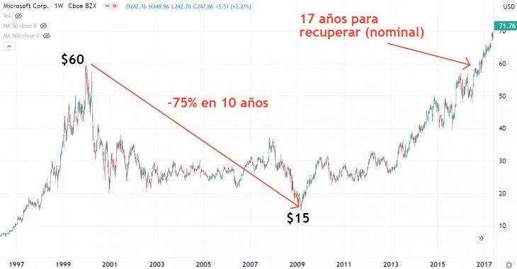 Si comprabamos Microsoft en el techo de 1999 nos hubiéramos encontrado 10 años después (sí, leyeron bien) un 75% abajo. Y hubieran pasado 17 años en recuperar el capital en términos nominales (¡sin tener en cuenta la inflación!). Y atención: este es un caso “exitoso”.