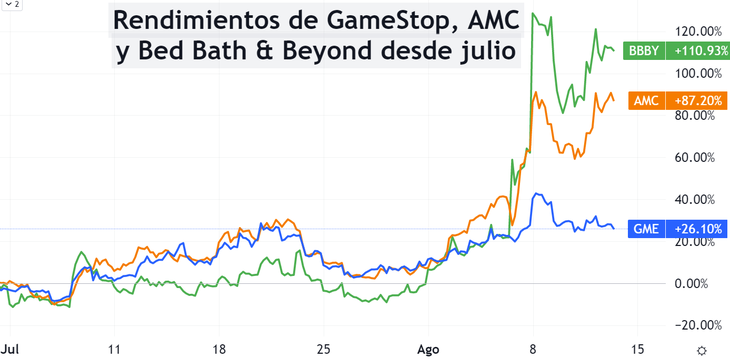 Desde principios de julio, GameStop ha subido un 26%, AMC un 87% y Bed Bath & Beyond escaló un 111%. Cabe aclarar que el S&P subió “tan solo” un 11%. Entonces, ¿qué explicación hay?