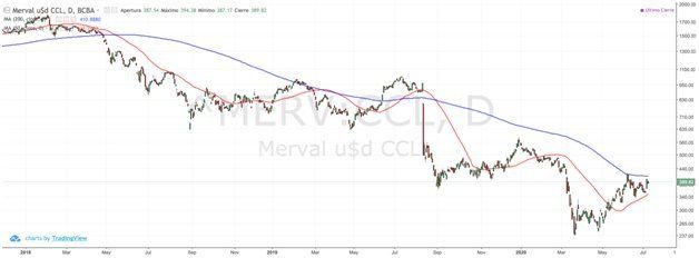 El gráfico muestra al índice Merval medido en dólares desde que comenzó su derrumbe en febrero de 2018. La línea azul muestra la media móvil de 200 ruedas y la línea roja muestra la media móvil de 50 ruedas. Estas líneas se usan para identificar potenciales cambios de tendencia. Hoy vemos que el Merval está por encima de la línea roja, pero todavía por debajo de la línea azul. En caso de que cruce la línea azul desde abajo hacia arriba, tendremos más chances de que los precios sigan subiendo.