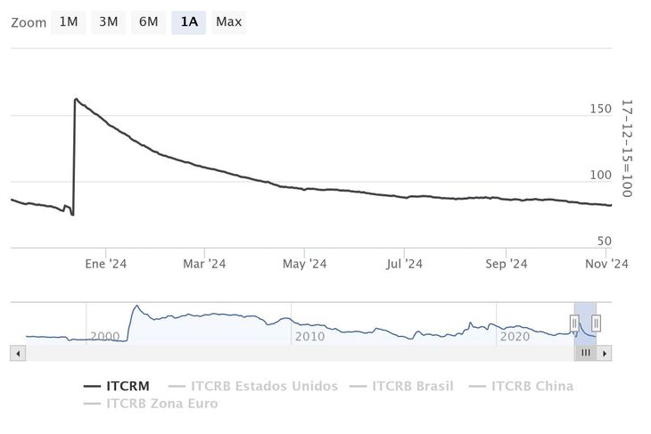 Aunque la inflación parece estar bajo control en el corto plazo, el atraso cambiario sigue siendo una preocupación central. Según datos del tipo de cambio real multilateral (TCRM), el peso argentino se encuentra apreciado respecto a niveles de hace un año, al 4 de noviembre de 2024 el TCRM se ubica en 82.01 comparado con 86.10 de 12 meses atrás, lo que podría generar presiones en el sector exportador y aumentar la demanda de importaciones en el futuro. La experiencia pasada de Argentina ha mostrado que un tipo de cambio fijo o controlado en exceso puede resultar en una pérdida de competitividad, con consecuencias perjudiciales para la balanza comercial y las reservas internacionales.