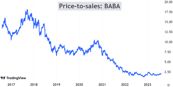 Tal como se ve en el gráfico, Alibaba está en los niveles más bajos de su historia, teniendo en cuenta sus ventas. Es decir, también está “barata” en comparación con su promedio. ¿Puede estar “más barata”? Sí, claro.