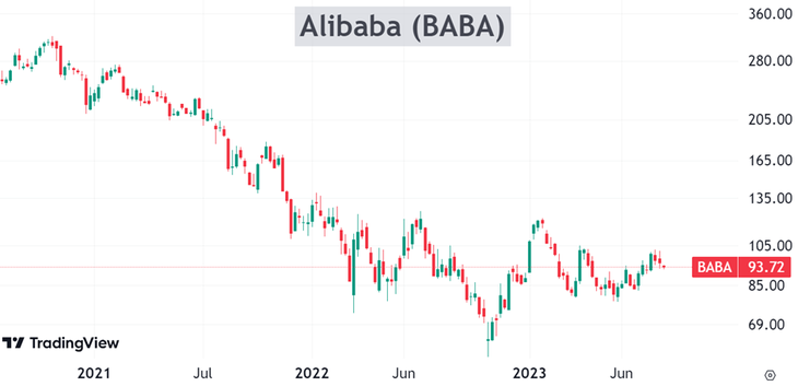 Alibaba, a pesar de sus oscilaciones, se encuentra lateralizando hace más de un año. Recordemos que llegó a caer un 82%, en gran parte por el riesgo político de China. Alibaba fue la primera empresa en ser perseguida y controlada duramente por el gobierno. Ha recibido multas enormes y fue gravemente perjudicada, para poder aplicar prácticas antimonopólicas. Además, China mantuvo mucho tiempo su política de “cero covid”, que golpeó fuertemente a las empresas.