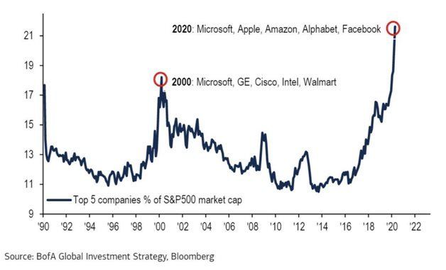 En la burbuja del 2000 las 5 mega empresas eran Microsoft, General Electric, Cisco, Intel y Walmart y llegaron a representar el 18% del S&P 500. Hoy estos nombres son Microsoft, Apple, Amazon, Google y Facebook pero el porcentaje que representan es aún mayor: 22% del S&P500.