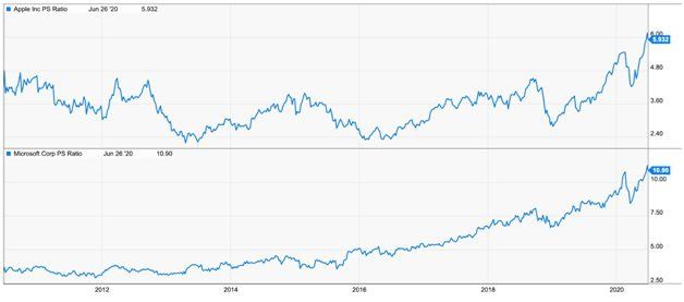 Apple y Microsoft están marcando su mayor nivel de Price-to-Sales de los últimos 10 años y en valores simplemente descabellados. Cada una de estas compañías vale u$s 1.5 Trillions. Pero, si además sumamos la valuación de Amazon (USD 1.4T) y Google (USD 1T), entre las cuatro, representan el 21% del valor total de la deuda de los Estados Unidos. Algo huele mal,¿ verdad?