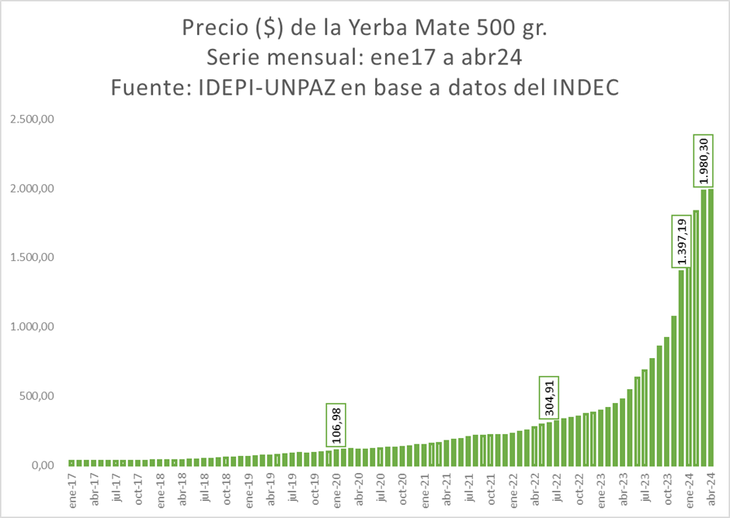 La salida de molino en abril de 2024 cayó un 30%, mientras en este mismo mes la yerba mate se estuvo vendiendo a $1.980 (medio kilo), en abril de 2023 su precio fue de $474, en diciembre de 2023 estuvo cercano a los $1.400. Esto está teniendo un fuerte impacto en el consumo si tenemos en consideración que los niveles inflacionarios siguen cercanos a los 300%, que tal vez este mes puedan bajar a 290% pero aún así muy pocas paritarias le pudieron ganar a este nivel de inflación.