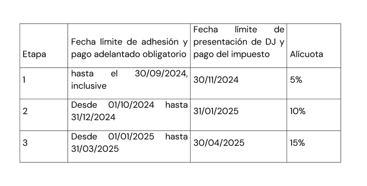 El impuesto especial del blanqueo se determinará según la etapa de adhesión, de acuerdo con el siguiente calendario: