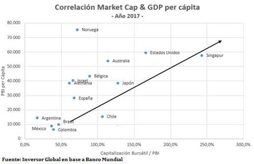 Hay una relación directa entre el PBI per cápita (riqueza por habitante de un país) y el tamaño del mercado de capitales (medido por el valor de mercado de las empresas en relación el PBI). Mientras sigamos ignorando la necesidad de que nuestro mercado de capitales sea un actor principal en la reconstrucción del país, asignando eficientemente el ahorro a la inversión, difícilmente salgamos de esta trampa de decadencia.