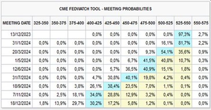 La baja en la inflación fue bien recibida por el conjunto de inversores, ya que pierde fuerza la perspectiva de aumentos de tasa de interés en el futuro. En las últimas semanas observamos un retroceso de los rendimientos a lo largo de toda la curva soberana en Estados Unidos respondiendo a la expectativa de que la Fed llegue al final del ciclo monetario, impulsando el precio de las acciones. El mercado asigna ahora una probabilidad del 97% de que la autoridad monetaria mantenga la tasa en la próxima reunión del 13 de diciembre y lleve a cabo un recorte en marzo de 2024.