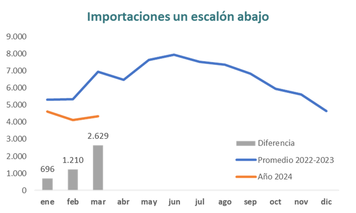 Dado que marzo ha arrojado un nivel muy bajo, posiblemente en los próximos meses empecemos a ver una suba gradual de importaciones. Eso implica que el efecto financiamiento (más productos ingresados que pagados) seguirá vigente. Recién en el segundo semestre podría empezar a equilibrarse.