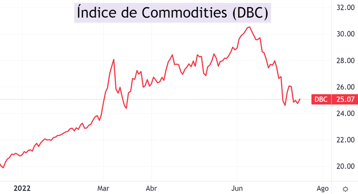Veamos el rendimiento de DBC, un ETF que replica un índice de commodities, conformado por petróleo, gas natural, soja, maíz, trigo, azúcar, aluminio, cobre, oro y plata, entre otros: