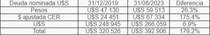 La inflación entre el mes de agosto del año 2023 y diciembre del año 2019 fue del 621%, con lo cual podríamos decir que la deuda pública medida en moneda local, creció en su totalidad al ritmo de la inflación.