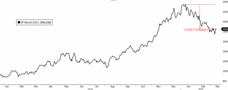En el plano local, no solo impactó lo que viene ocurriendo a nivel global. Se suma la fuerte caída en los precios internacionales del crudo -que afecta particularmente al sector Oil & Gas- y factores totalmente idiosincráticos. Los inversores locales, luego de un 2024 con retornos desorbitantes, se encuentran ansiosos a la espera de nuevos "drivers". El mercado descontó muy rápidamente las buenas noticias que se fueron dando el año pasado y ahora ha quedado expectante.