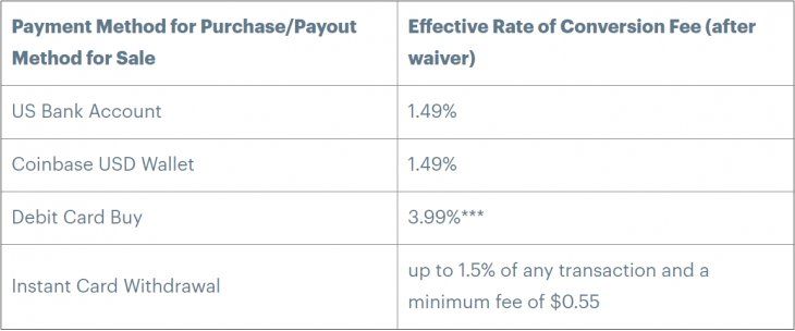 Para que tengan una idea del delirio, Coinbase cobra una comisión base de 0,5% más una comisión adicional que varía según el país del usuario y el método de pago. Este es el esquema de esos fees para EEUU: