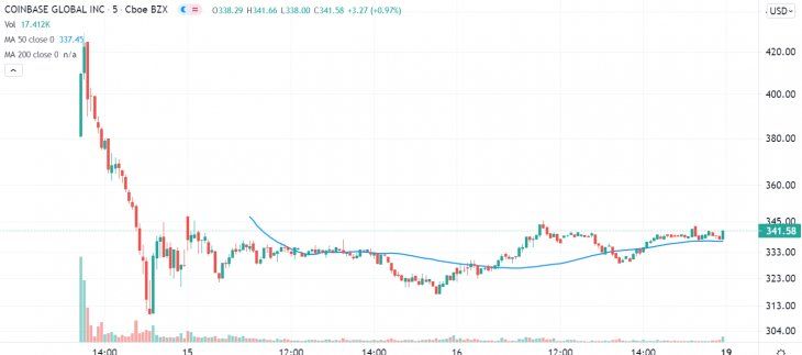 Coinbase comenzó a cotizar el miércoles en el Nasdaq a un precio de u$s 381, rápidamente subió a casi u$s 429, y luego bajó fuerte cerrando la semana en u$s 341,6.