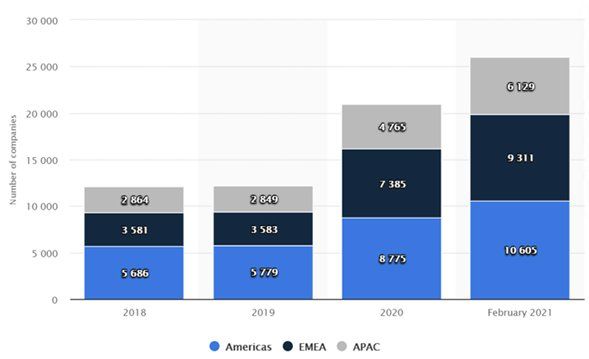 Como está creciendo las startups fintech en el mundo, sólo en Estados Unidos durante los primeros dos meses del 2021 se habían registrado 10.605 nuevas empresas fintech, lo que contrasta con las 9.311 en EMEA y 6.129 en APAC.