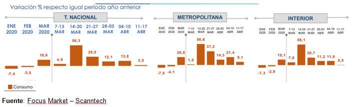 En este cuadro sobre una medición de Focus Market vía scanntech (lector de código en 603 puntos de venta de todo el país) observamos el otro lado del mostrador que es el consumo masivo (alimentos, bebidas, artículos de limpieza y cuidado personal). La caída de las ventas minoristas involucra a comerciantes, profesionales independientes, autónomos, sociedades que son el sector mipyme. Es decir la clase media integrada en eslabonamientos de diferentes rubros económicas en quizás la crisis más grande que les a tocado atravesar. Pero así como las ventas se derrumban en sus mostradores también comienzan a mostrar un comportamiento de fuerte restricción del gasto por caída fenomenal de sus ingresos cuando actúan en posición de demanda para la reposición de productos básicos en sus hogares. Vemos que semana tras semana el consumo masivo desacelera el crecimiento de las semanas previas a la cuarentena y las de inicio de la cuarentena pasando de un crecimiento exponencial del 56,3 % interanual a un leve crecimiento del solo 2,5 %.