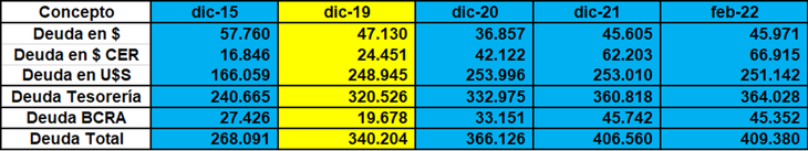 El gobierno de Alberto Fernández asumió en diciembre de 2019 con una deuda de U$S 320.526 millones, a febrero de 2022 la deuda suma U$S 364.028 millones.