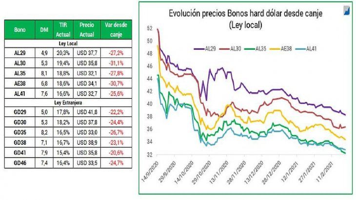 Los bonos argentinos cotizan a precios de un país que está en cesación de pagos, esto está directamente relacionado con los vencimientos del Club de París y el FMI este año, y los que vienen para el año 2022 y 2023, en todo concepto suman u$s42.492 millones, más del 10% del PBI y superior al 100% de las reservas.