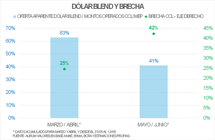 En gráficos se muestra lo que sucedió desde marzo a junio con esa oferta aparente y cautiva. Tal como se observa la oferta disminuyó fuertemente. Pasó de representar el 60/65% de la demanda de CCL/MEP a representar el 40% (o menos). Concordantemente la brecha subió de 25% al 42%.