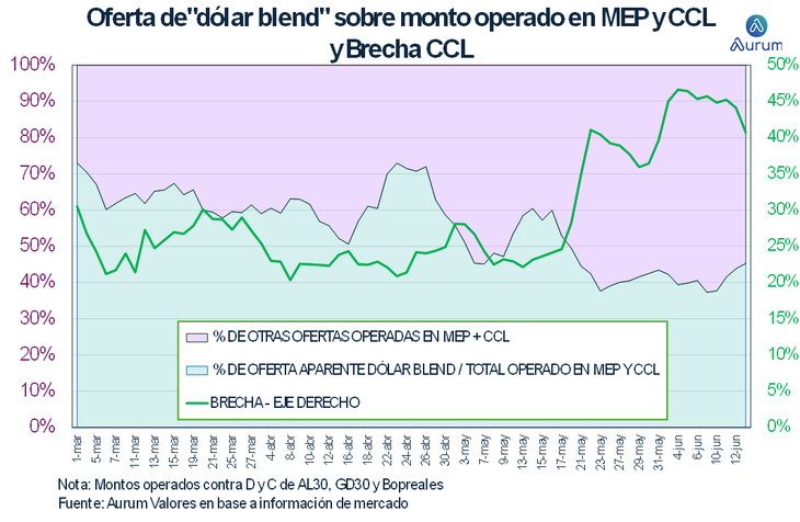 Con ambos datos se puede estimar qué proporción del monto operado en MEP y CCL fue abastecida con la estimación de la oferta aparente de “Dólar Blend”, ya que no solo es importante si el monto ofertado cae o mejora, sino que nos interesa saber el porcentaje de lo demandado que se cubre por esa oferta. Y nos interesa saber ese porcentaje porque a diferencia de un oferente normal en el mercado de CCL/MEP el que liquida “Dólar Blend” no dispone de plazos para ejecutar esa oferta. Está limitado desde el momento en que liquidó la exportación sin poder esperar a un precio de CCL/MEP que le resulte atractivo. Es, en definitiva, una oferta cautiva.