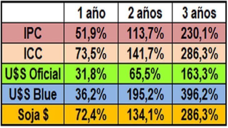 El índice de precios al consumidor registra en tres años una inflación del 230,1%, mientras que, en igual período, el Índice de la Cámara de la Construcción, el cual se utiliza para actualizar el valor de las cuotas en la compra de departamentos en la construcción, aumentó el 286,3%. En igual período, el dólar oficial aumentó el 163,3%, mucho menos que la construcción y el índice de precios al consumidor, lo que denota un tipo de cambio que comienza a apreciarse. Bienvenido el atraso cambiario.