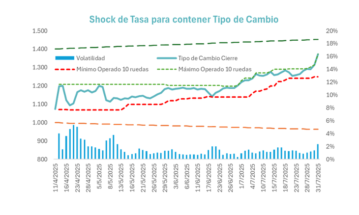 Por esa lógica de valor del tipo de cambio y distancia en tasa al techo de la banda, es que resulta contradictoria la situación actual, cercana al techo de la banda con niveles de tasas, tanto nominal fija como real, cercano a los máximos desde el inicio de la flotación.