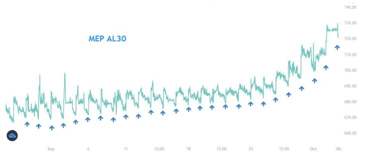 Dólar MEP AL30: recordemos que cualquier MEP consiste en comprar dólares mediante la operatoria de bonos (se compran bonos con pesos, se espera el parking y se los vende en dólares). El gobierno interviene activamente en el mercado de bonos, específicamente en este bono AL30, tanto tramo pesos como dólares, para contener el valor del dólar bolsa. El MEP AL30 ronda los $ 720.