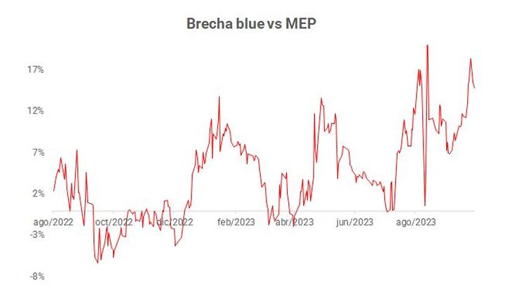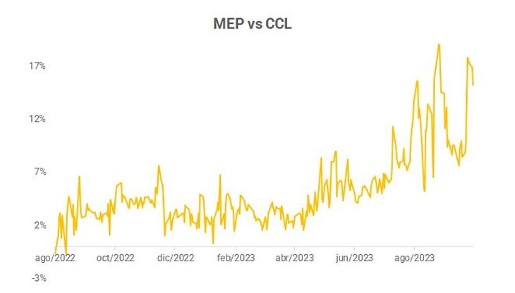 Aumenta la brecha con el oficial, pero también el canje, esto es, la diferencia entre el CCL y el MEP, expresada en porcentaje.