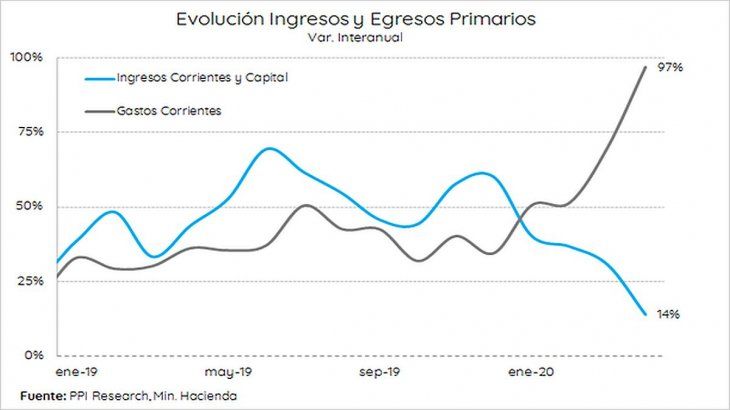 Los gastos se dispararon para intentar contener a los sectores vulnerables y los ingresos corrientes se derrumbaron con la caída de la actividad. De acuerdo al Índice de Producción Industrial de Orlando Ferreres, en abril se produjo la peor caída mensual de la historia de 26,7% interanual (incluso mayor que la caída de 18,7% de diciembre de 2001).