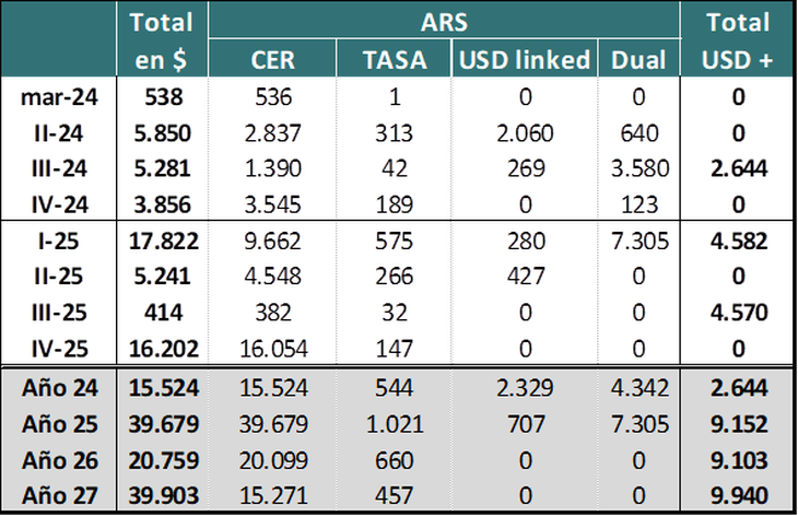 De esta manera, en lo que resta de 2024 quedan vencimientos por $15,5 billones más u$s2.644 millones en moneda extranjera. Los años siguientes muestran un aumento de los vencimientos en pesos, pero lo más relevante es que se elevan a un promedio de más de u$s9.000 millones los vencimientos en moneda extranjera.