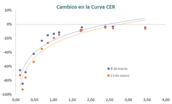 La suba de tasas por lo tanto dejó en una situación compleja a aquellos inversores que no habían calzado dicha venta con la compra de otros activos a similar plazo. Porque las nuevas tasas cambiaron de manera significativa las distintas curvas de pesos, con un aumento de las paridades de los bonos CER para adaptarse al nuevo escenario de valuación.