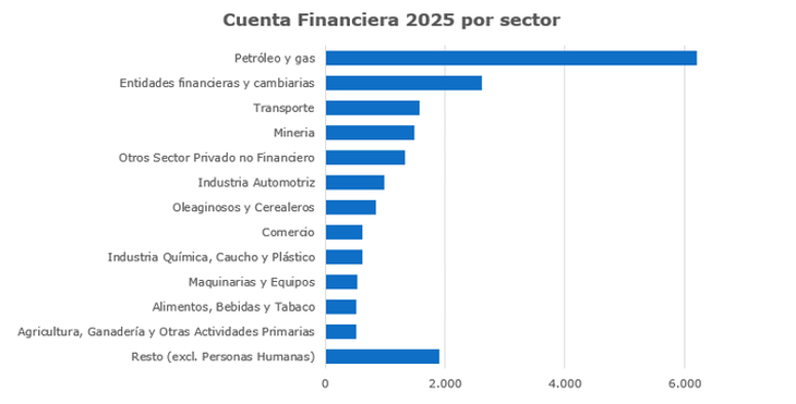 Si analizamos el resto de los sectores de la economía, en comparación con Petróleo y Gas, vemos que el financiamiento externo es notablemente menor. El segundo sector con la mayor cuenta financiera fue el sector financiero, con un ingreso de u$s2.622 millones. El resto de los sectores, entre los cuales se encuentran la minería, las agroexportaciones y toda la industria, apenas reunieron u$s10.937 millones de financiamiento. Esto excluye a las personas humanas, que por la compra de divisas presentaron un déficit de más de u$s30.000 millones.