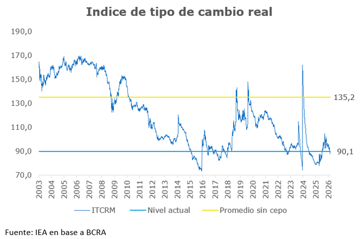El índice de tipo de cambio real multilateral hoy se ubica por debajo del promedio de los últimos veinte años (-33%, tomando los años sin cepo desde 2003). Más allá de la discusión puntual sobre su nivel exacto, lo relevante es la tendencia: el precio relativo que organiza la estructura productiva argentina se movió en una dirección consistente con un proceso de apreciación real en un contexto de ingreso de capitales.
