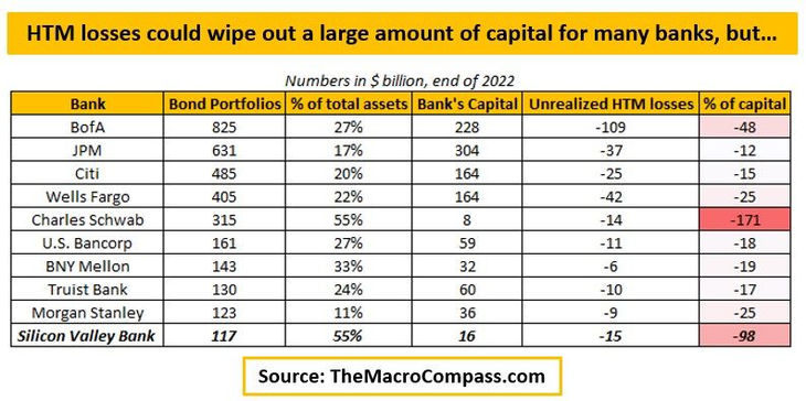 ¿Cuáles son los peores? Charles Schwab (SCHW) y Bank of America (BAC). ¿Por qué? Simplemente lo dice el mercado que vota todos los días en tiempo real. Esto no debería sorprender, ya que son los dos bancos que tienen las mayores pérdidas no realizadas como proporción de su capital.