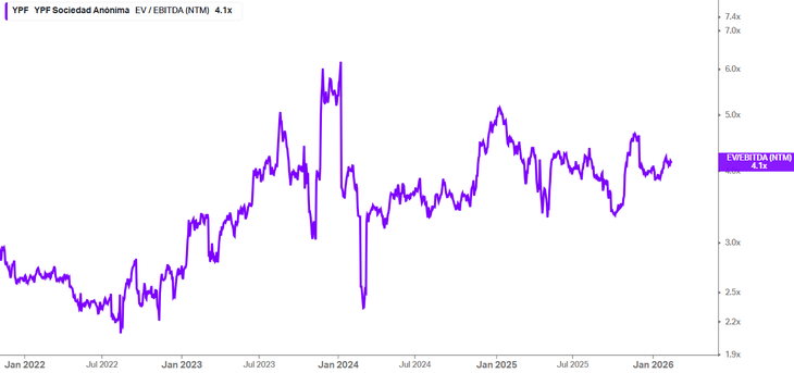 Después viene la pata de la valuación. Cuando decimos que YPF cotiza cerca de 4x EV/EBITDA forward, lo que estamos midiendo es cuánto paga el mercado por toda la compañía en relación con la caja operativa que genera.