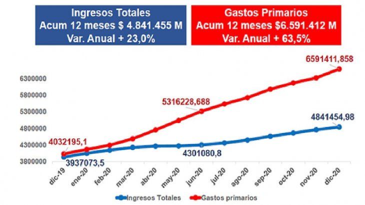 Durante el año 2020 los ingresos crecieron el 22,8% anual, y los gastos corrientes el 67,9% anual. El pago de intereses cayó el 16%, el resultado fiscal fue de $ 2.292.831 millones. Durante el año 2020 los adelantos transitorios del Banco Central y las transferencias de utilidades sumaron $ 2.014.702 millones, casi el déficit del Estado.