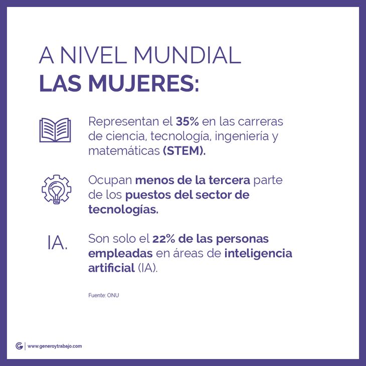 Como informa ONU, a nivel mundial, las mujeres representan actualmente solo el 35% en las carreras de ciencia, tecnología, ingeniería y matemáticas (STEM). Al mismo tiempo ocupan menos de la tercera parte de los puestos del sector de tecnologías y sólo son el 22% de las personas empleadas en áreas de inteligencia artificial (IA).