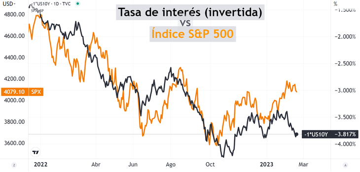 Las acciones tienen una relación inversa a la tasa de interés, y esto se acentúa cuando las acciones son tecnológicas. Este gráfico muestra cómo le va a las acciones (naranja) cuando la tasa de interés (en negro) sube. La tasa de interés está graficada de modo inverso, para que de este modo se visualice con más claridad la relación: