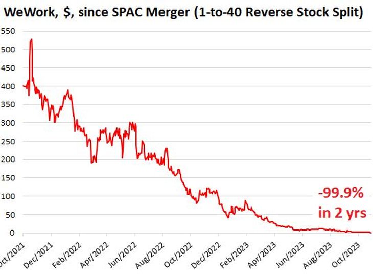 Lo que pasó posteriormente con las acciones de WeWork es historia. Se produjo una feroz caída de prácticamente el 100% en 2 años. De hecho, el viernes 3 de noviembre, las acciones cerraron a un valor de USD 0,84.