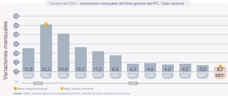 En un país acostumbrado a los altos niveles de inflación, la noticia de una desaceleración en el índice de precios parece un respiro largamente esperado. Según los últimos datos publicados por el Instituto Nacional de Estadística y Censos (INDEC), la inflación de octubre fue del 2.7%, marcando el fin del ciclo de incrementos de entre 4% y 5% mensuales que dominaron los meses previos.