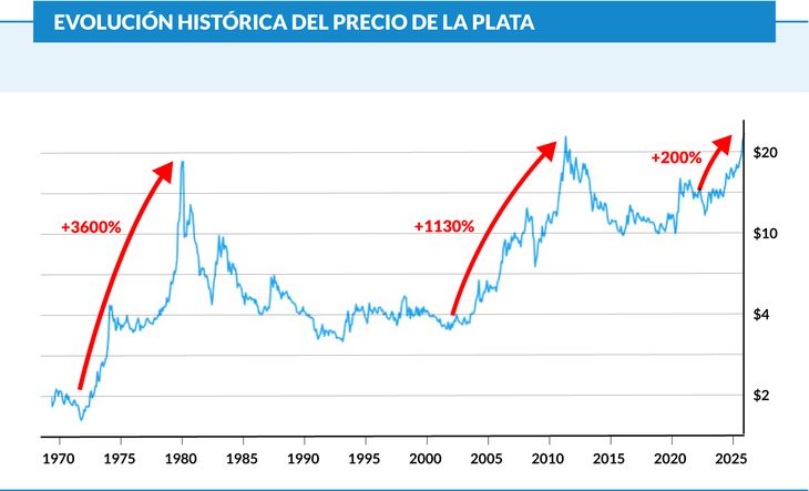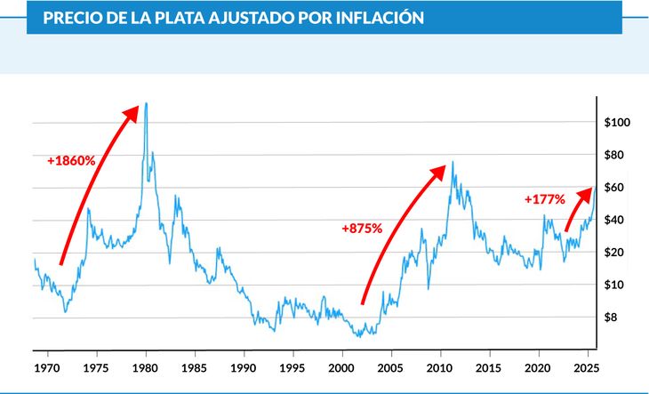 ¿Cuál promete ser el mejor trade del 2026? La plata. Otra vez. Vamos a estudiar un gráfico histórico. Podemos distinguir en el pasado reciente dos grandes ciclos alcistas en la plata: 1970s: +3.600% en 98 meses y 2.000s: +1.130% en 113 meses.