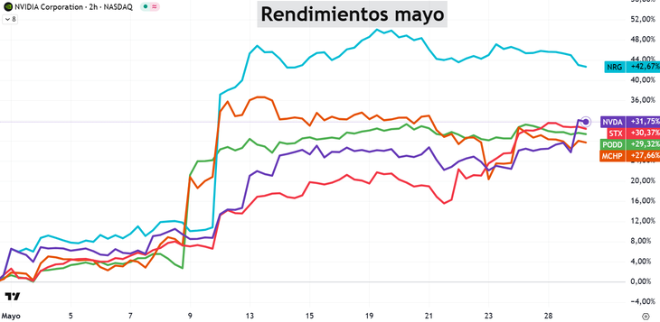 Y entre todo ese reacomodamiento, estas fueron las 5 acciones del S&P 500 que más subieron en mayo: