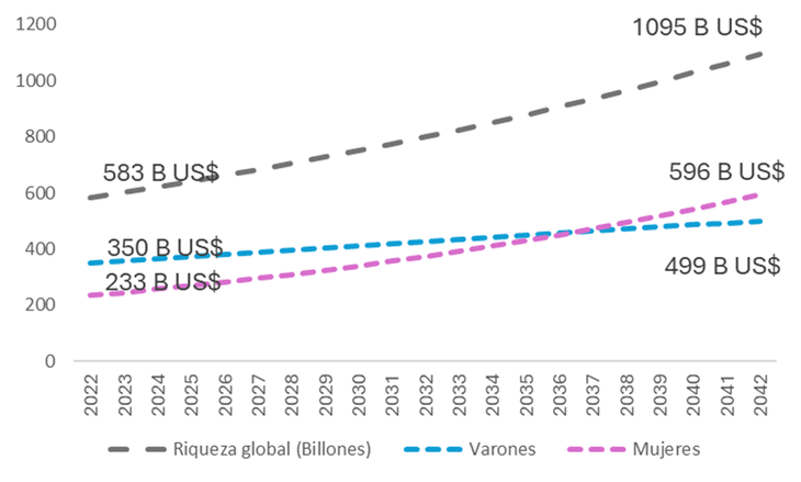 Se proyecta para 2037 que las mujeres tendremos el mismo patrimonio que los varones. Y para 2042, se vislumbra que las mujeres controlaremos el 55% de la riqueza global.